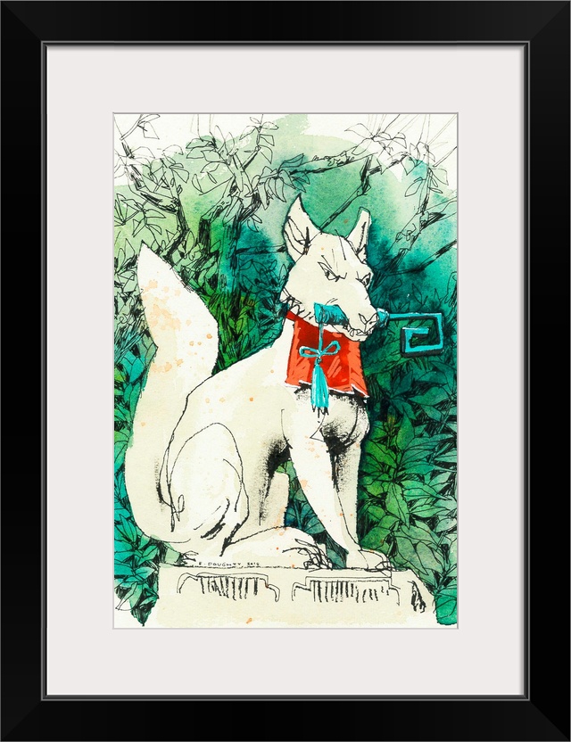 <p>Watercolor and ink illustration of one of the many fox statues on the grounds of the world-famous Fushimi Inari temple in Kyoto, Japan. Many businesspeople travel to this temple to pay their respects to these deities for good luck in their ventures, as well as others who pray for general prosperity. The key in this fox's mouth is for a rice granary.</p>