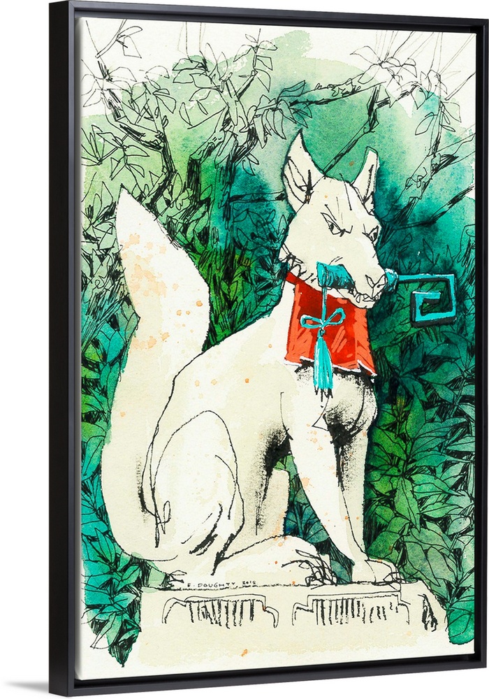 <p>Watercolor and ink illustration of one of the many fox statues on the grounds of the world-famous Fushimi Inari temple in Kyoto, Japan. Many businesspeople travel to this temple to pay their respects to these deities for good luck in their ventures, as well as others who pray for general prosperity. The key in this fox's mouth is for a rice granary.</p>