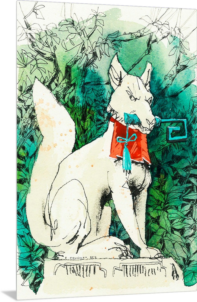 <p>Watercolor and ink illustration of one of the many fox statues on the grounds of the world-famous Fushimi Inari temple in Kyoto, Japan. Many businesspeople travel to this temple to pay their respects to these deities for good luck in their ventures, as well as others who pray for general prosperity. The key in this fox's mouth is for a rice granary.</p>
