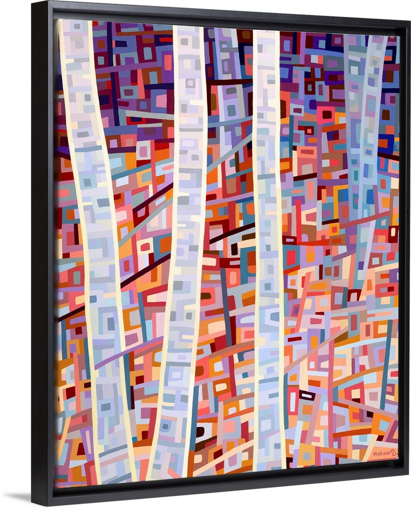 <p>Mandy Budan’s art style is more than unique. Using acrylic colors to weave lines and shapes together like a tapestry, she creates breathtaking images from the simplest forms. Though the multicolored dots of “Standing Room Only” may seem like a scattering of disparate, broken circles up close, a step back reveals a stunning forest scene reminiscent of stained glass. In “Solitaire,” a close examination reveals an intricate collection of interlocking pieces, almost like peeking at the delicate harmony of gears in a pocket watch. Yet again, a step away from the canvas transforms her design into an unrestricted dance of fluid lines and curves in a blossom. Whether it’s the soft floral pinks of “Cascade,” the gold turning crimson in “Stormlight,” or the sweeping blues of “Thaw,” wall art from Mandy Budan adds more than color to a room; it invites visitors to discover something new each time they encounter it.</p>