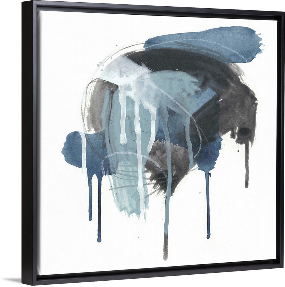 <p>Square abstract painting in black, blue and white with drips of the overlapping paint on a white background.</p>