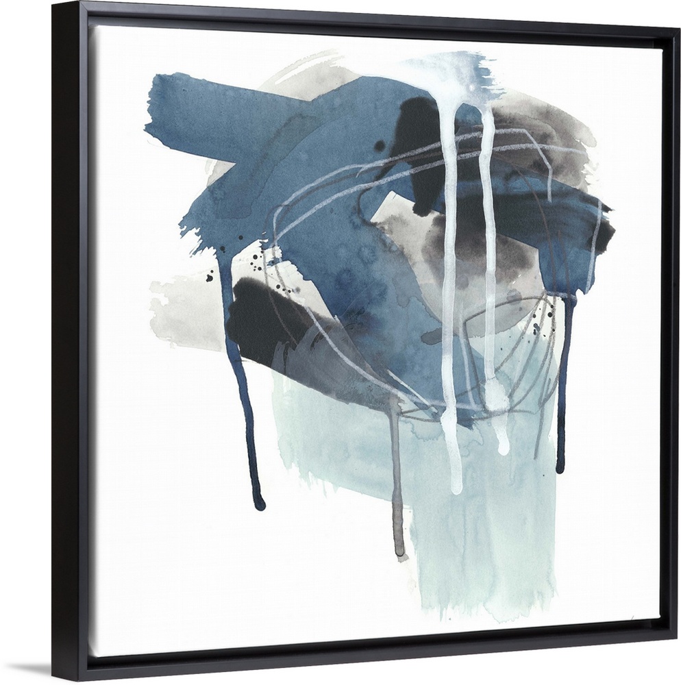 <p>Square abstract painting in black, blue and white with drips of the overlapping paint on a white background.</p>