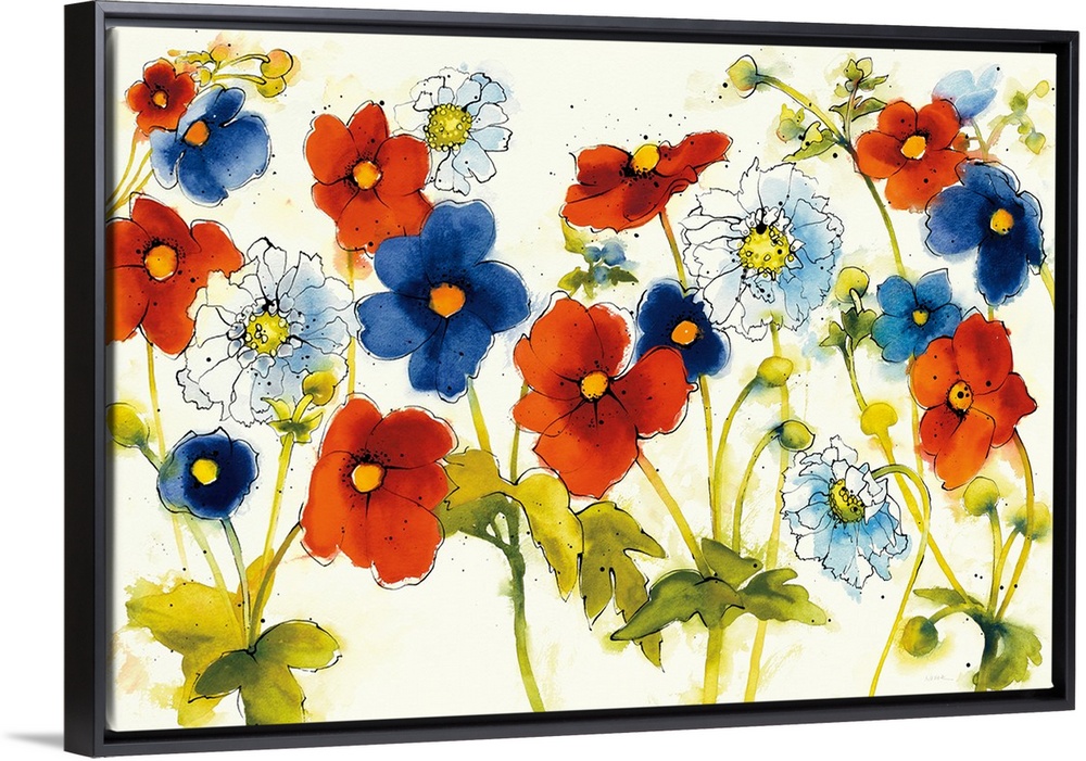 <p>Large watercolor painting with red-orange, blue, and white flowers on a white background with a little bit of black paint splatter.</p>