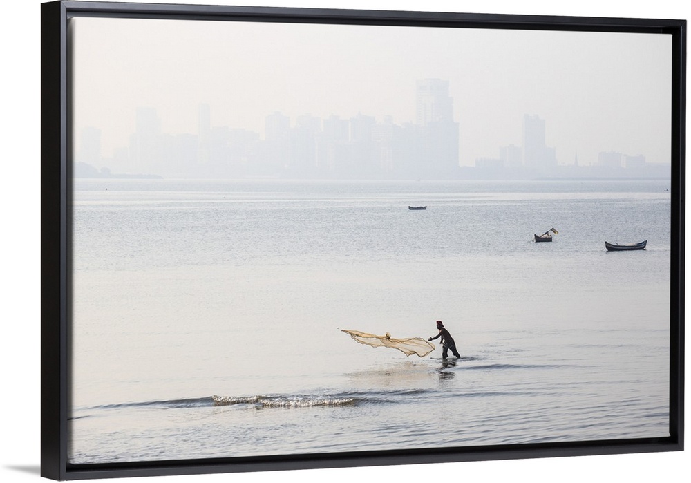 <p>India, Maharashtra, Mumbai, Chowpatty, Man fishing.</p>