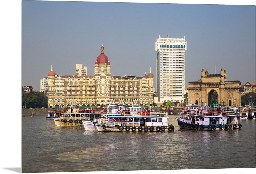 <p>India, Maharashtra, Mumbai, Taj Mahal Palace Hotel and Gateway of India.</p>