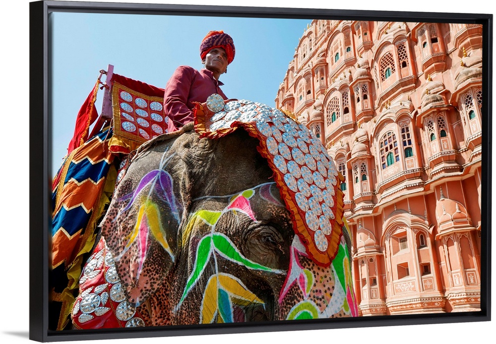 <p>India, Rajasthan, Jaipur, Ceremonial decorated Elephant outside the Hawa Mahal, Palace of the Winds, built in 1799, (MR)</p>