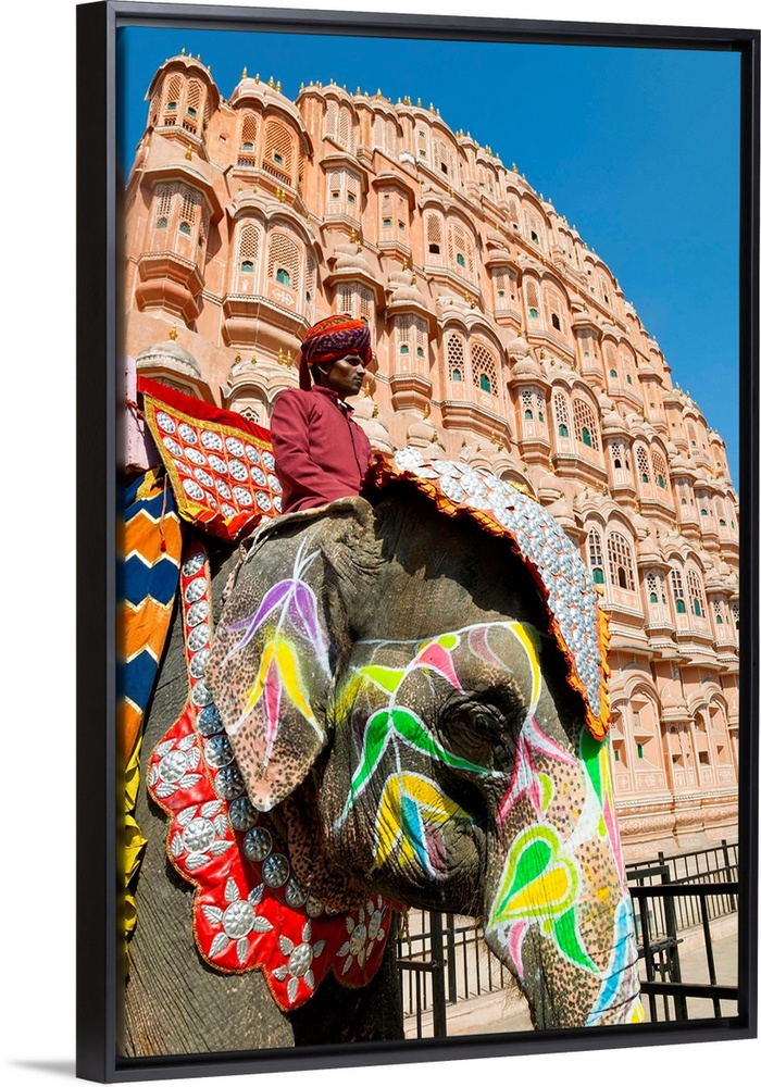 <p>India, Rajasthan, Jaipur, Ceremonial decorated Elephant outside the Hawa Mahal, Palace of the Winds, built in 1799, (MR)</p>