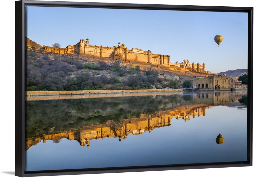 <p>India, Rajasthan, Jaipur, Amer. The magnificent 16th century Amber Fort at sunrise with a hot air balloon aloft.</p>