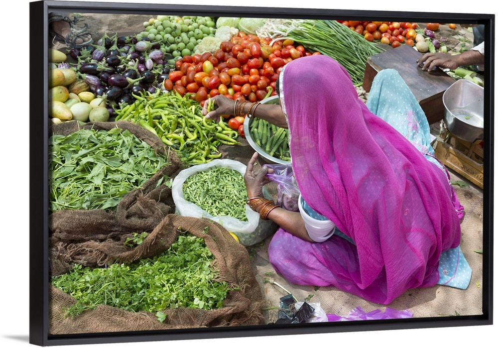 <p>India, Rajasthan, Jaisalmer, A woman sells vegetables at a market</p>