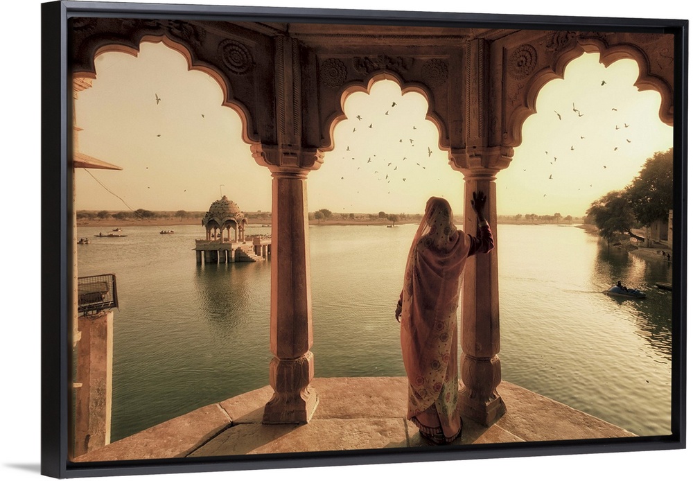 <p>India, Rajasthan, Jaisalmer, Gadi Sagar Lake, Indian Woman wearing traditional Saree outfit</p>