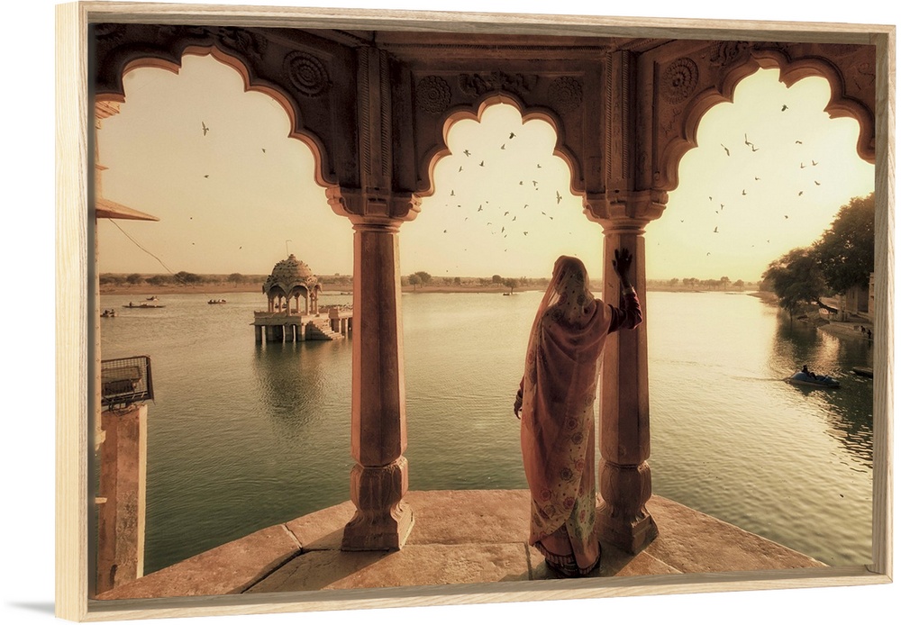 <p>India, Rajasthan, Jaisalmer, Gadi Sagar Lake, Indian Woman wearing traditional Saree outfit</p>
