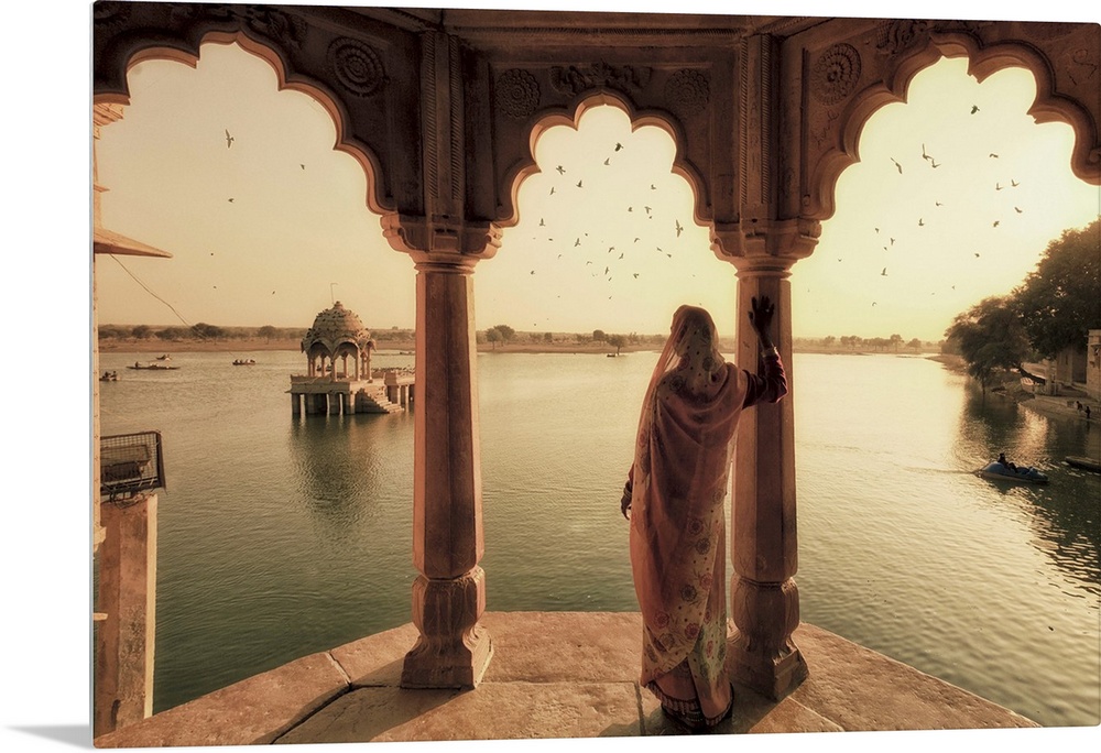 <p>India, Rajasthan, Jaisalmer, Gadi Sagar Lake, Indian Woman wearing traditional Saree outfit</p>