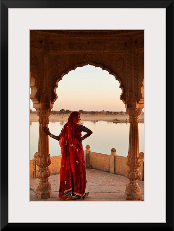 <p>India, Rajasthan, Jaisalmer, Gadi Sagar lake, Woman wearing a sari on the lake.</p>