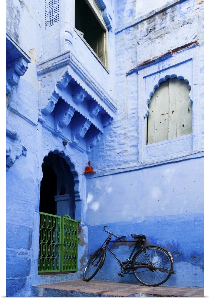 <p>India, Rajasthan, Jodhpur, Bike resting against a wall of a blue house.</p>