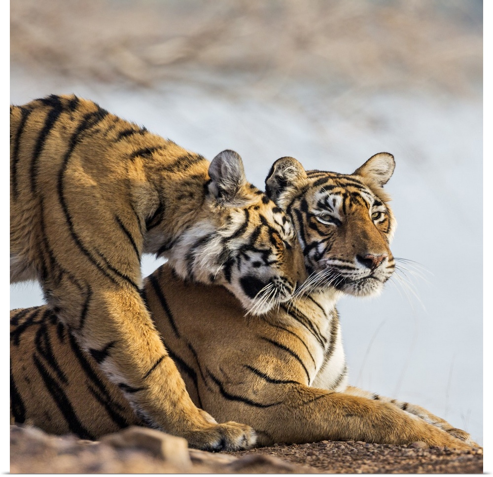 <p>India, Rajasthan, Ranthambhore. A female Bengal tiger is greeted by one of her one-year-old cubs.</p>