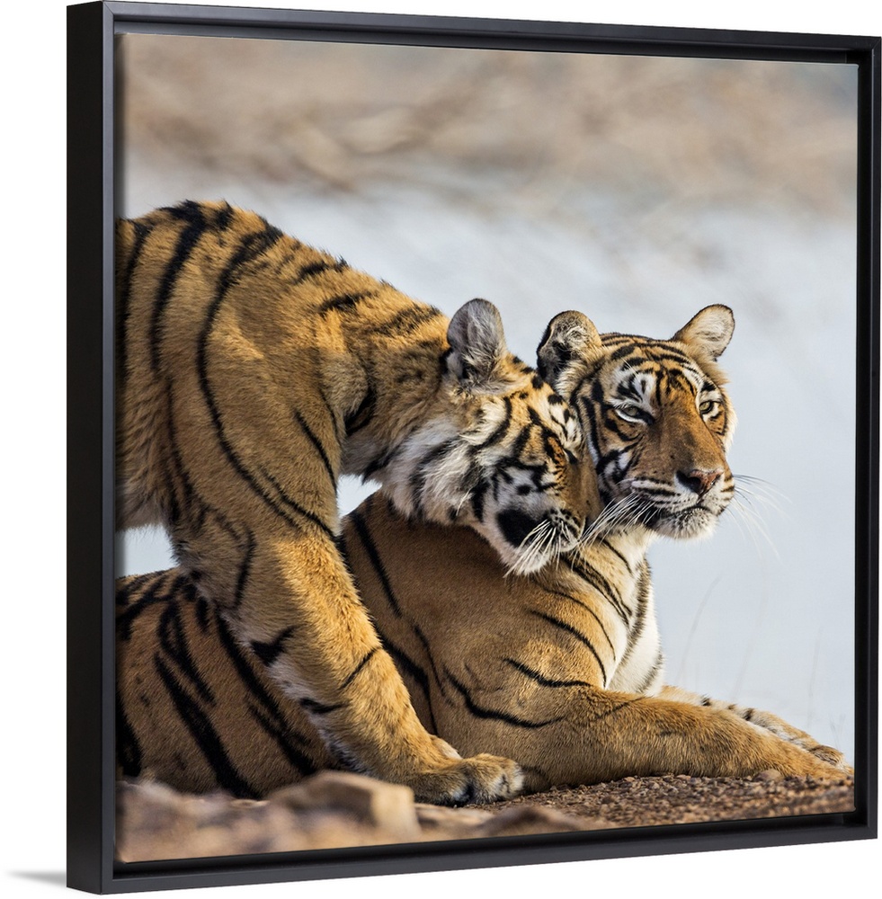 <p>India, Rajasthan, Ranthambhore. A female Bengal tiger is greeted by one of her one-year-old cubs.</p>