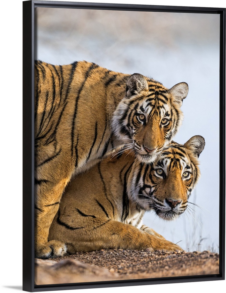 <p>India Rajasthan, Ranthambhore. A female Bengal tiger with one of her one-year-old cubs.</p>