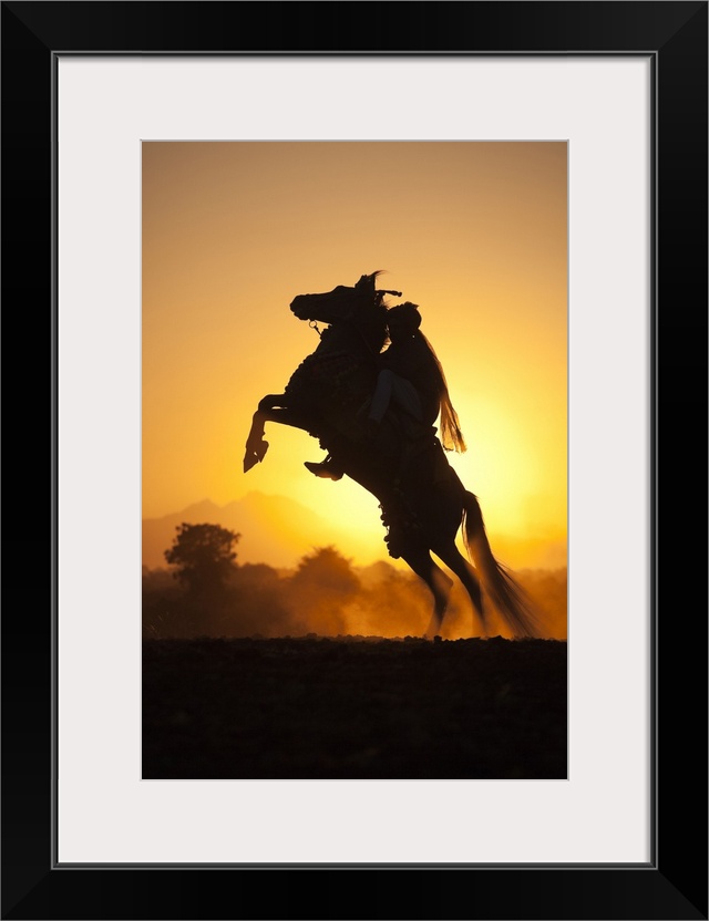 <p>India, Rajasthan, A typically dressed rider on a rearing Kathiawari horse backlit in the sunset</p>