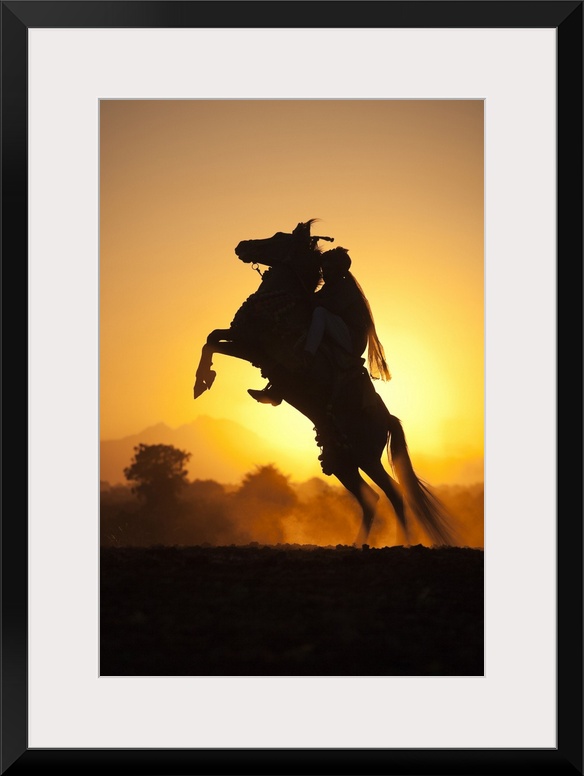 <p>India, Rajasthan, A typically dressed rider on a rearing Kathiawari horse backlit in the sunset</p>