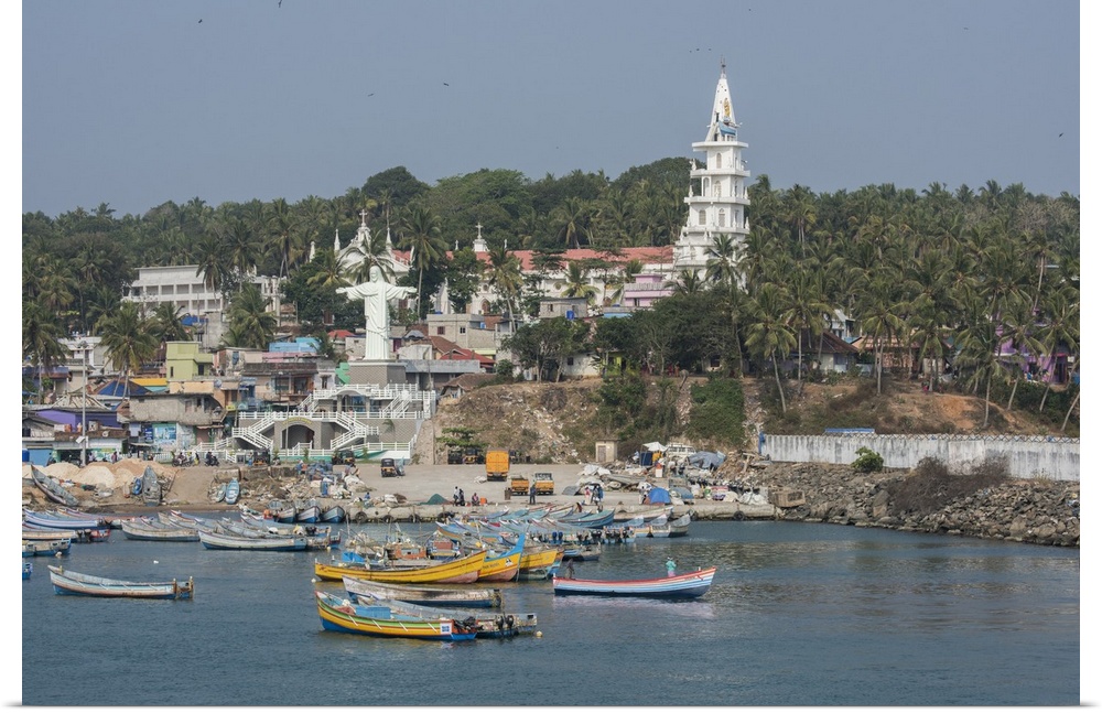 <p>India, state of Kerala, Malabar Coast, port city of Villanjam aka Vizhinjam along the coast of the Arabian Sea. Port view of fishing village with St. Joseph's Shrine in the distance.</p>