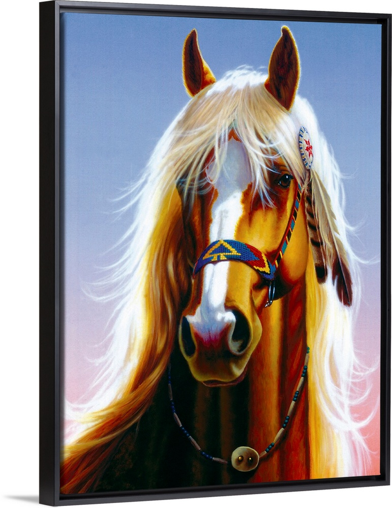 <p>Big, vertical wall hanging of a horse from the neck, up, looking forward while wearing a bridal made of Native American beading, two feathers hanging down near one of his ears. On a background of light, pastel tones.</p>