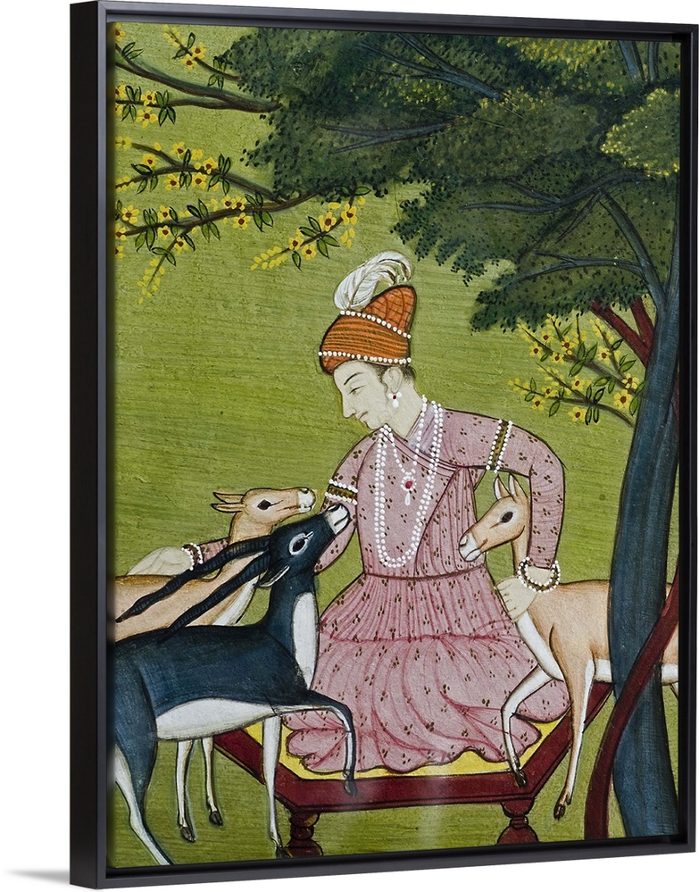 <p>An Indian Rajput style miniature dating to 19th century showing 'Ahimsa'. Ahimsa is a tenet of the Indian Religions (Hinduism, Buddhism and Jainism) meaning kindness and non-violence towards living things including animals. The black buck (male and female shown here) were kept in menageries by Moguls who were also keen hunters (using cheetah amongst other animals). The mogul style headwear could also suggest that a prince attending his menagerie is a possible alternative (and less gentle) theme of the image.</p>