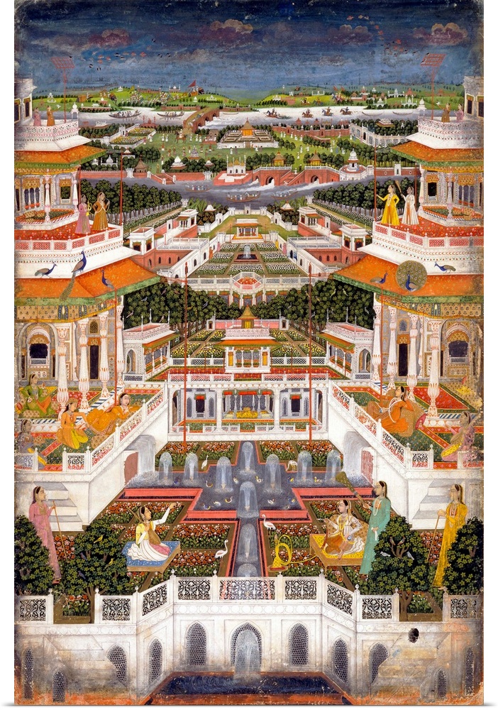 <p>Miniature painting of a lavish palace complex in an expansive landscape, with a harem garden with women, fountains and peacocks in the foreground, c. 1765, created in Faizabad or Lucknow, India, private collection.</p>