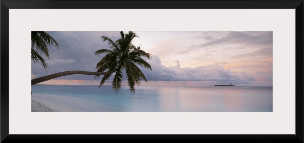 <p>Large art piece of the still ocean with a cooler toned sky above. Palm trees float over the sand and water.</p>