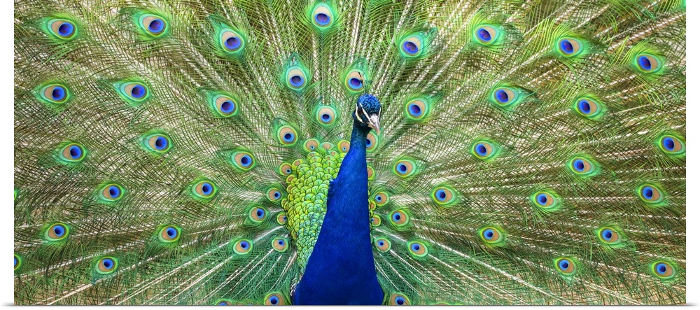 <p>Indian peafowl (Pavo cristatus) proudly displaying the feathers of it's train; Fort Collins, Colorado, United States of America</p>
