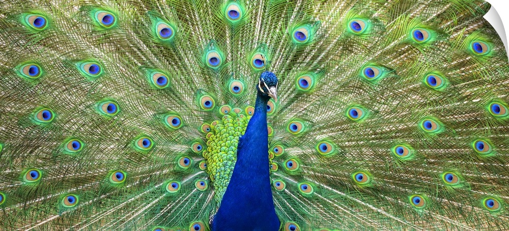 <p>Indian peafowl (Pavo cristatus) proudly displaying the feathers of it's train; Fort Collins, Colorado, United States of America</p>