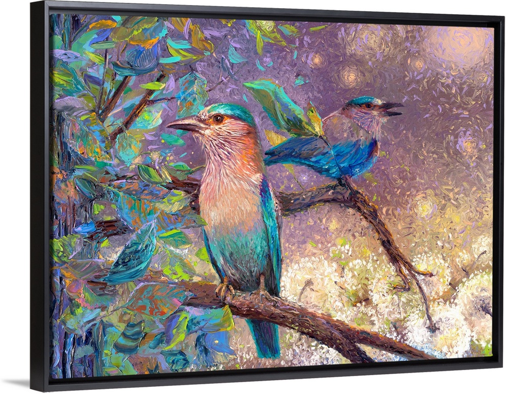 <p>Brightly colored contemporary artwork of Indian rollers sitting in a tree.</p>