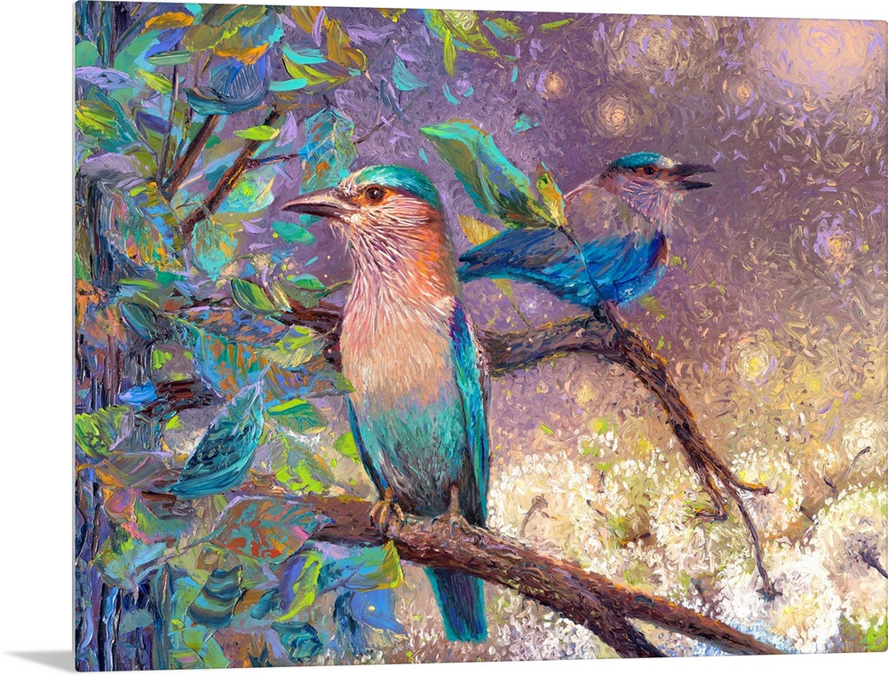 <p>Brightly colored contemporary artwork of Indian rollers sitting in a tree.</p>