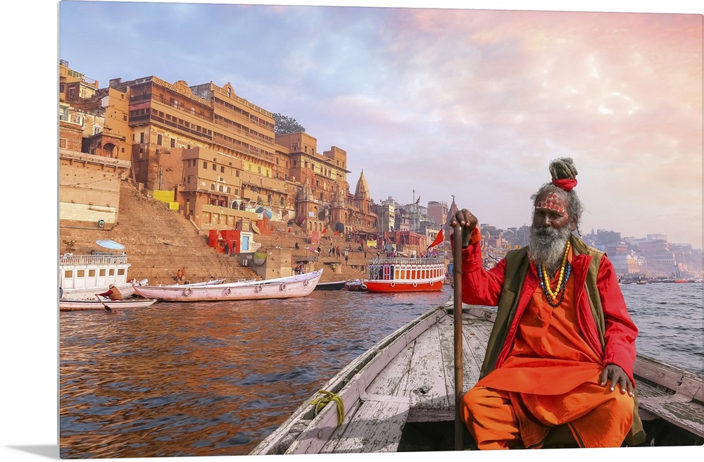<p>Indian Sadhu Baba Takes A Boat Ride On River Ganges Overlooking Varanasi City At Sunset</p>