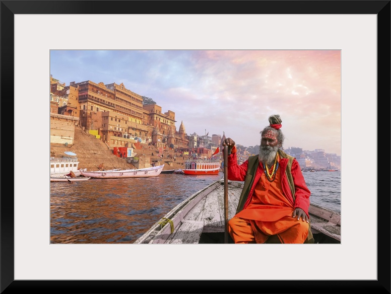 <p>Indian Sadhu Baba Takes A Boat Ride On River Ganges Overlooking Varanasi City At Sunset</p>