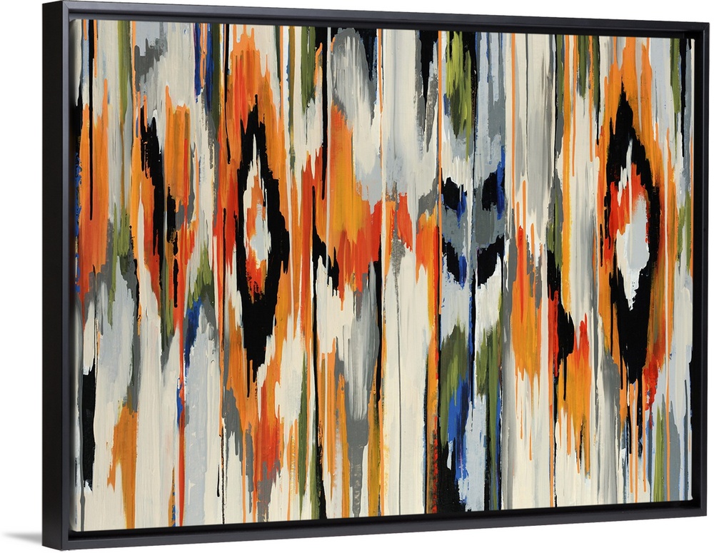 <p>Large horizontal contemporary art of circular patters in vibrant colors that are distorted and streaking vertically on a light background.</p>