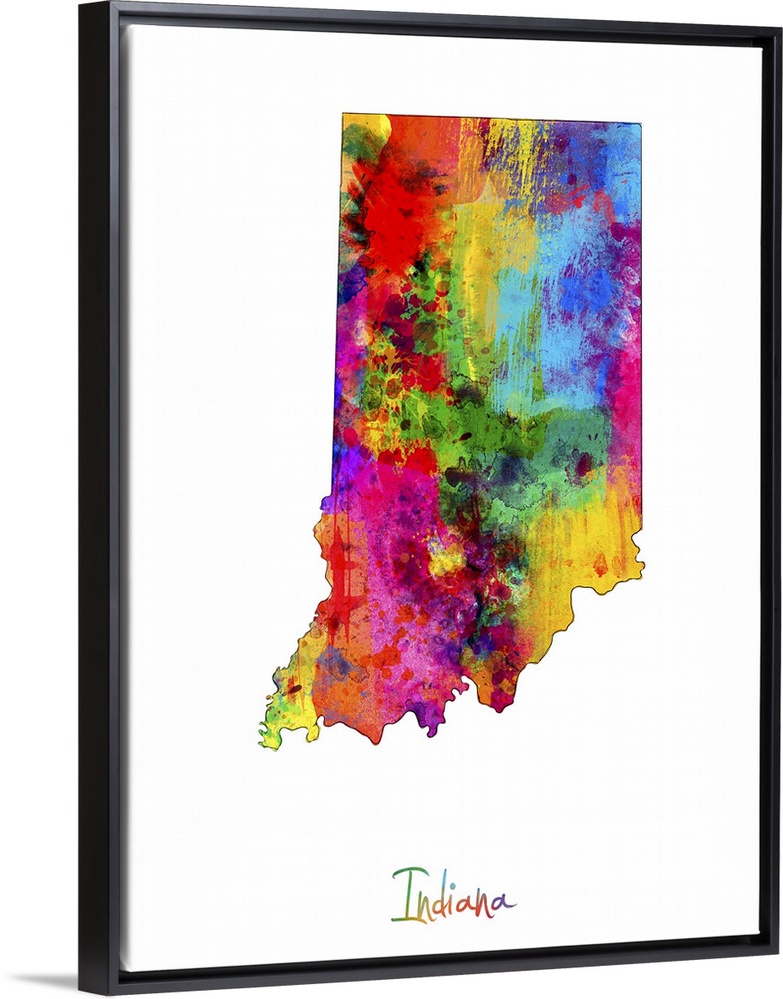 <p>Contemporary artwork of a map of Indiana made of colorful paint splashes.</p>