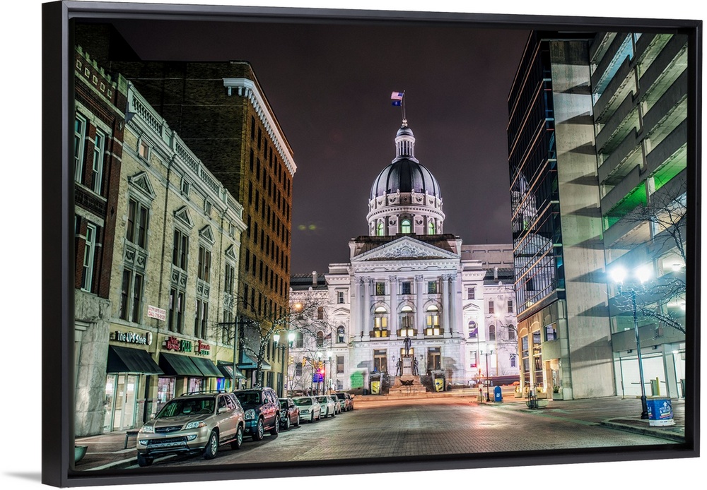 <p>Photo of the Indiana State House at night.</p>