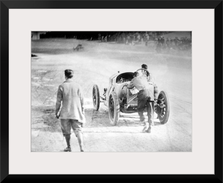 <p>Driver Ralph DePalma, right, and his riding mechanic Rupert Jeffkins push their broken down car towards the finish line at the endof the 1912 Indianapolis 500 Mile Race.</p>