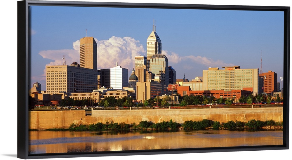 <p>Photograph of the Indianapolis, Indiana city skyline from the water on a sunny day.</p>