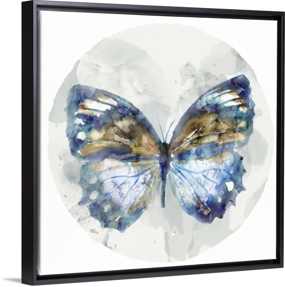 <p>Watercolor artwork of a butterfly with broad blue and copper colored wings on a grey circular design.</p>