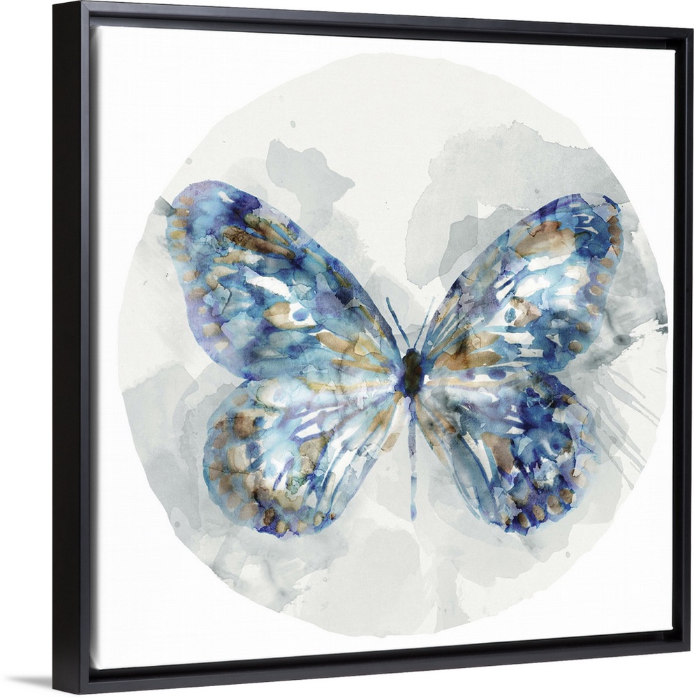 <p>Watercolor artwork of a butterfly with broad blue and copper colored wings on a grey circular design.</p>