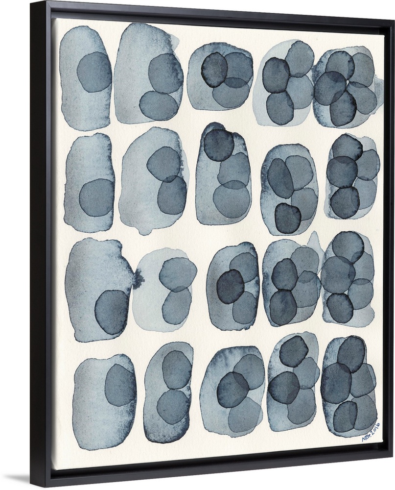 <p>Contemporary abstract painting of a grid of organic shapes in indigo blue against a neutral background.</p>