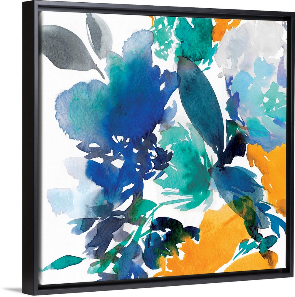 <p>Decorative art with abstract florals in bold orange and blue hues on a white square background.</p>