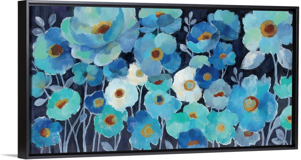 <p>Contemporary painting of various blue toned flowers together.</p>