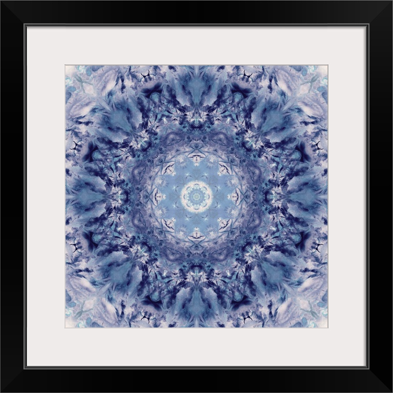 <p>Square abstract art in shades of blue and white hues with kaleidoscope-like patterns and designs.</p>