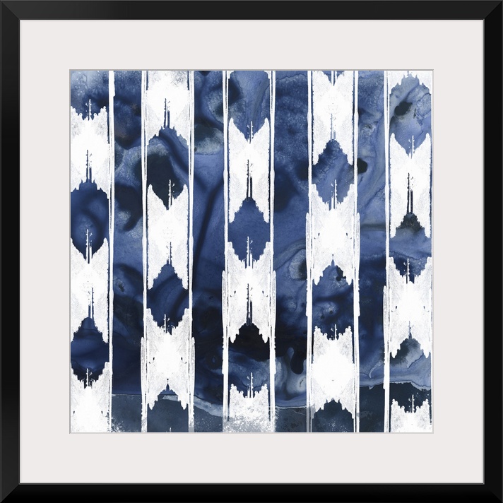 <p>Shibori style artwork in white and indigo of classic pattern motifs.</p>