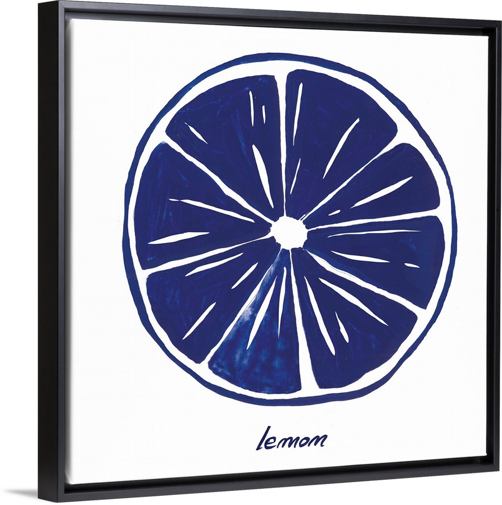 <p>Navy blue ink wash painting of a lemon slice on white.</p>