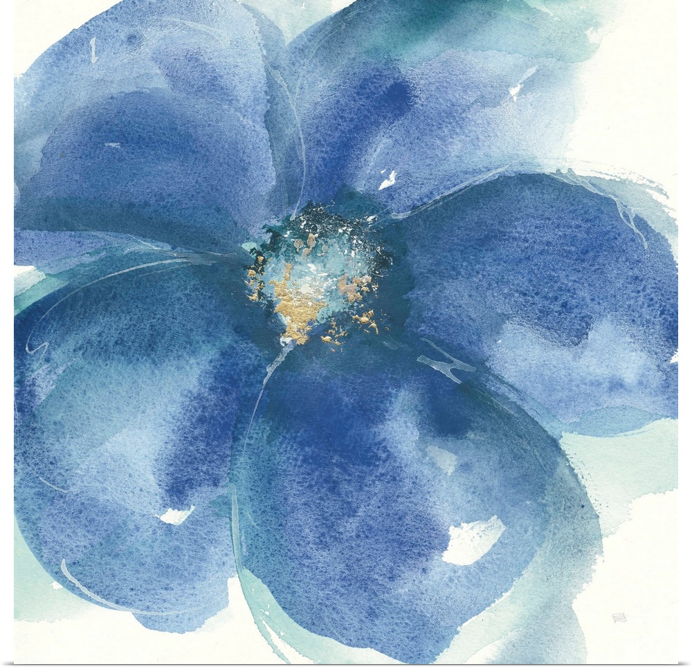 <p>Large square contemporary painting of blue flowers with accents of gold.</p>