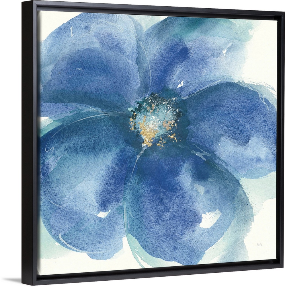 <p>Large square contemporary painting of blue flowers with accents of gold.</p>