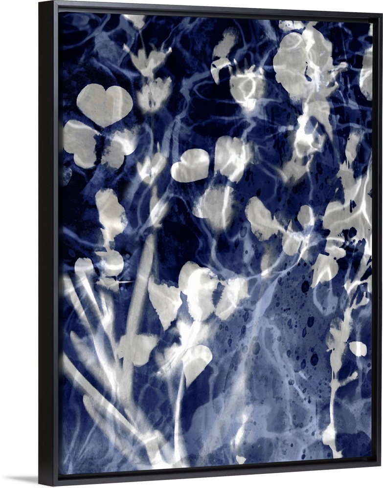 <p>Home decor with silver silhouettes of leaves and flowers on an indigo background with a watery look.</p>